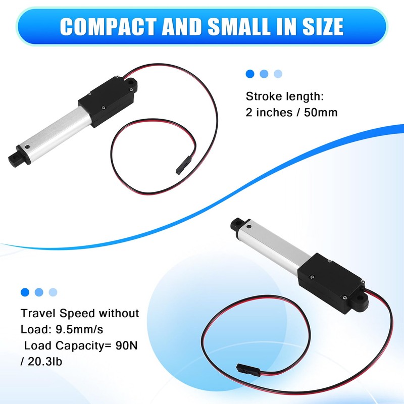 - [Specification]Stroke length: 2 inches / 50mm; Travel Speed without Load: 9.5mm/s; Load Capacity= 90N / 20.3lb; Input Voltage: 12VDC.
