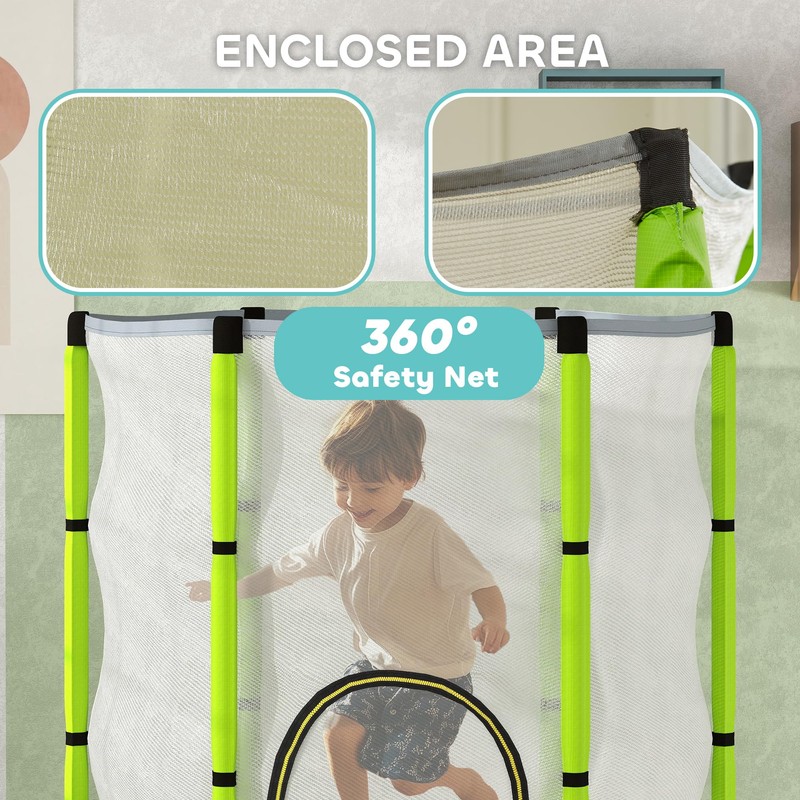 Discover the joy of bouncing with the Qaba 4.6FT kid's trampoline! It is designed with six foam-covered steel pipes for safety and a wear-resistant jump pad for endless fun. This trampoline for kids fits perfectly both indoors and outdoors, featuring a 360° safety net and cute patterns to keep your little ones engaged and active. Suitable as my first trampoline, this mini trampoline is a delightful gift for any child.