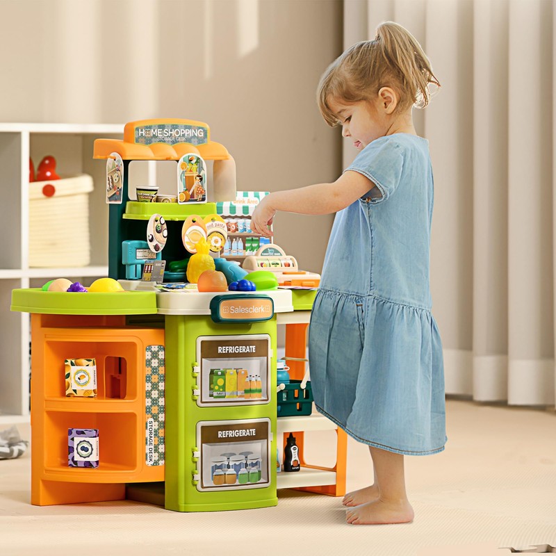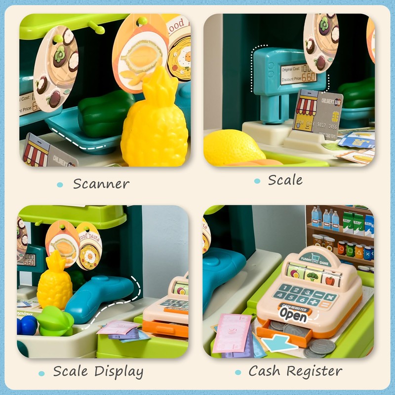 - - Immersive Learning through Play - Step into the world of interactive learning with this play grocery store. With 58 diverse accessories including a scanner, scale, scale display, and lifelike food items, your child will have a realistic grocery store experience that fosters imagination and education.