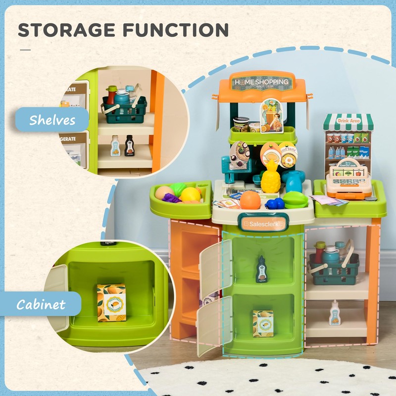 - - Grocery Store with Ample Storage - Promote organization and responsibility with this play grocery store, which features a storage shelf and cabinet. Your little cashier can keep the play area tidy while learning about the importance of keeping things in order.