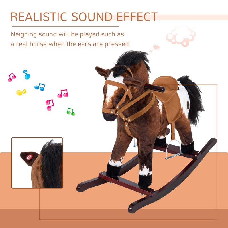 Qaba Kids Metal Plush Ride-On Rocking Horse Chair Toy with Realistic Sounds - Dark Brown/White