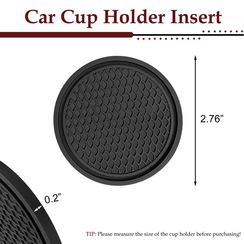 - Diameter: 7cm / 2.76". Thickness: 5mm / 0.2". TIP: Please measure the size of the cup holder before purchasing! Classic black color matches most car interiors.