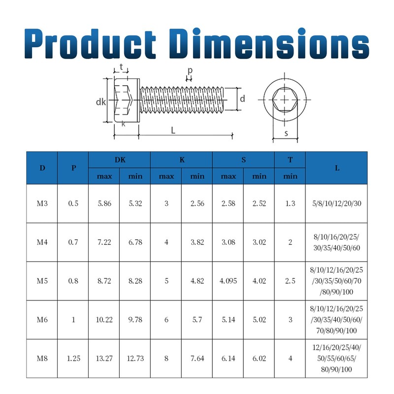 - Fully Threaded: Hexagon socket head cap screws have clean, precise threads manufactured to DIN 912 standards, ensuring uniformity of force and reducing the risk of slippage when fastening various items during installation.