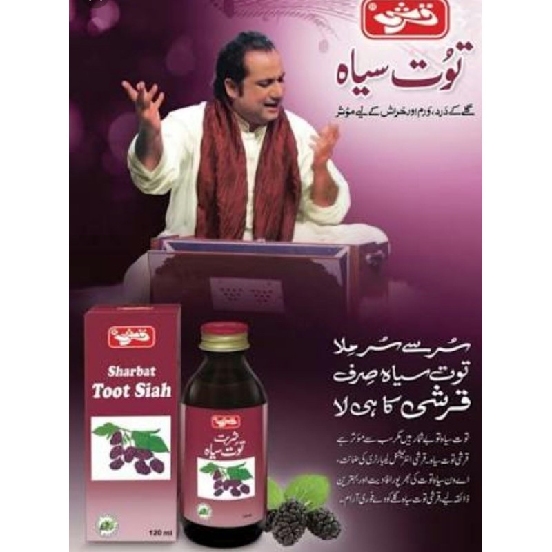 Product descriptionSharbat Toot Siah Syrup is effective in pharyngitis, hoarseness of voice and sore throat. It not only contains the extract but fruits pulp in it making it best natural cure for sore throat and related conditions. Thick black mulberry syrup alleviates the inflammatory condition of throat, induce soothing effects and subside pain and agitation caused by sore throat. Each 10ml contains: Black Mulberry 778.38mg Sodium benzoate 12.97mg Effective in swelling and pain of throat. Effective in hoarseness of voice and sore throat. Helps relieve swelling of throat in diphtheria. Dosage: Swallow gently. Children: 5ml (1teaspoonful) four times a day Adult: 10ml (2 teaspoonful) four times a day OR as directed Side Effects: Sharbat Toot Siah is a time tested product and is free of any side effects. Packaging: 120ml Shelf Life: Use within 3 years from the date of manufacturing. Storage: Keep away from sunlight and children.DirectionsSwallow gently. Children: 5ml (1teaspoonful) four times a day Adult: 10ml (2 teaspoonful) four times a day