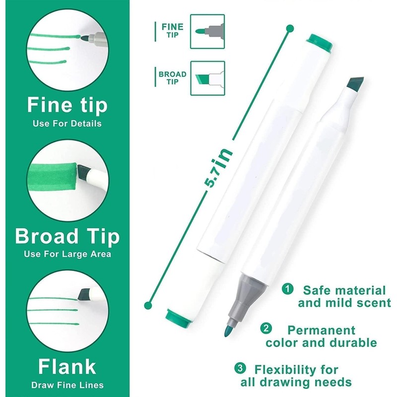 DOUBLE TIPPED MARKERS, DOUBLE THE FUN: Broad and fine twin tips for precise highlighting and underlining, for drawing with both thin and thick lines. Allows you to create various styles, sketches and patterns with ease. ALCOHOL-BASED INK, EASY BLENDING, NO SMUDGING: Forget about blotchy, uneven coloring. High-quality ink blends seamlessly to achieve beautiful coloring effects, even for beginners. Plus, your artwork will never fade or smudge with time. 108 VIBRANT COLORS: The rainbow is at your fingertips - choose from 108 brilliant colors and bring your ideas to life. Whether it's a coloring book or a masterpiece in the making, your artwork is sure to shine with these art markers. FAST DRYING MARKERS: Never let wet ink ruin your work again! Draw smudge-free thanks to its fast-drying, alcohol-based formula. Perfect marker set for kids' art class. COLOR-CODED CAPS, BONUS CASE, GREAT GIFT IDEA: The color-coded caps allow for ease in organization and use in identifying colors; And also, these marker pen set is equipped with a beautiful plastic case for ease in travelling and storing. Note: Please put the cap on the marker in time after use.