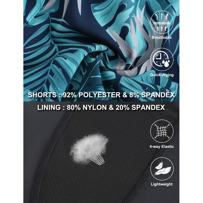 - 2 in 1 Swim Trunk Design: 90% Polyester & 10% Spandex (Compression liner: 90% polyester and 10% spandex). The stretchy fabric is soft and lets you move your legs freely.