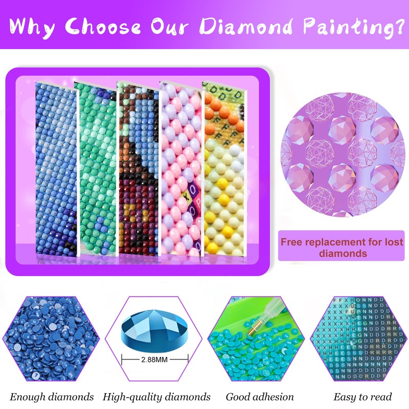 - 💎SPARKLING DIAMOND DESIGNS: Round diamond painting makes the diamond painting process easier and less frustrated. Diamonds in the picture have many sparkling facets, which can catch the light and sparkle, which match the color of the pattern on the canvas, never fade, and will sparkle in the light, more vibrant and brilliant than the resin diamonds, round diamond beads