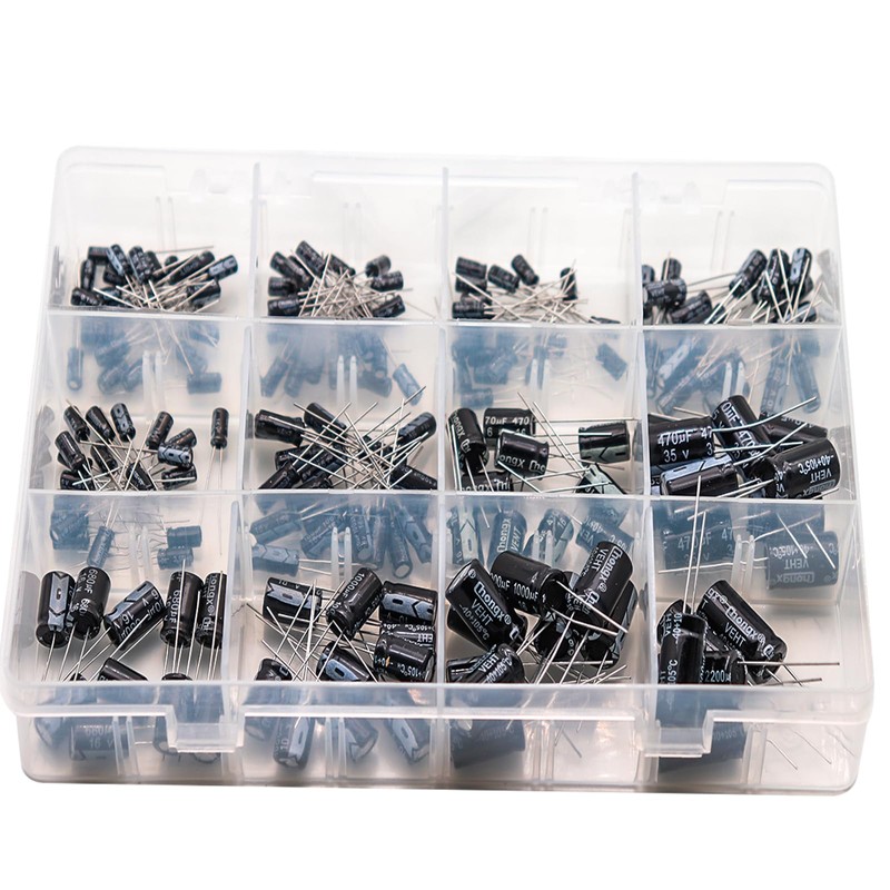 In this set, we offer 12 Value electrolytic capacitors include 10V 16V 25V 35V 50V, range from 0.1uF to 2200uF total 185pcs well packed in a plastic box, with clearly labeled compartments, parts inside will not slide or move around.