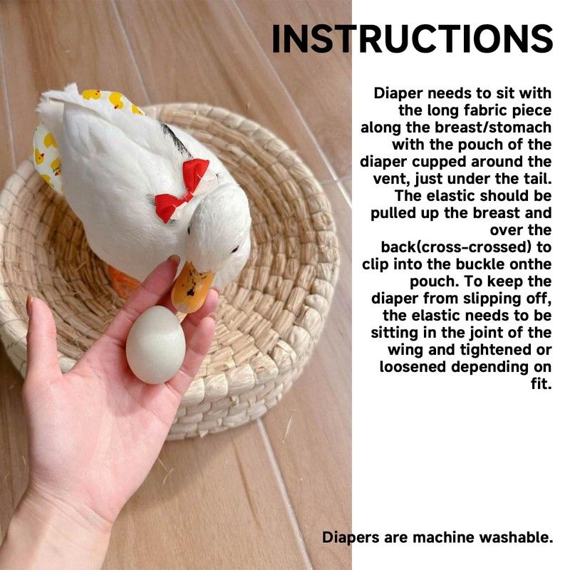 - EASY TO PUT ON: Our pet chicken diapers with elastic band are incredibly easy to wear. The 'H' shape in our duck nappy diapers allow us to cup around the pet's tail of the duck. No need to force the chicken duck goose wings into the poultry diaper