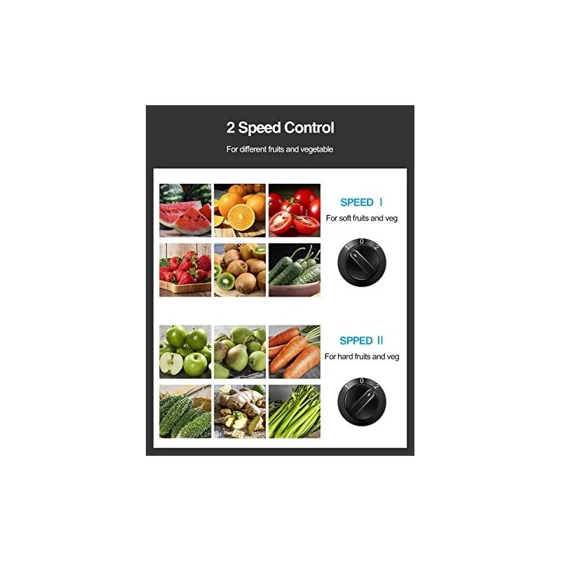 Dual Speed Juicer Machine - Juicer Machine with 2 speed control(12000-18000 RPM), "1" low speed for soft fruits and veg, such as watermelon, orange, strawberry etc. “2” high speed for some hard fruits and veg, such as carrot, apple, pear etc.