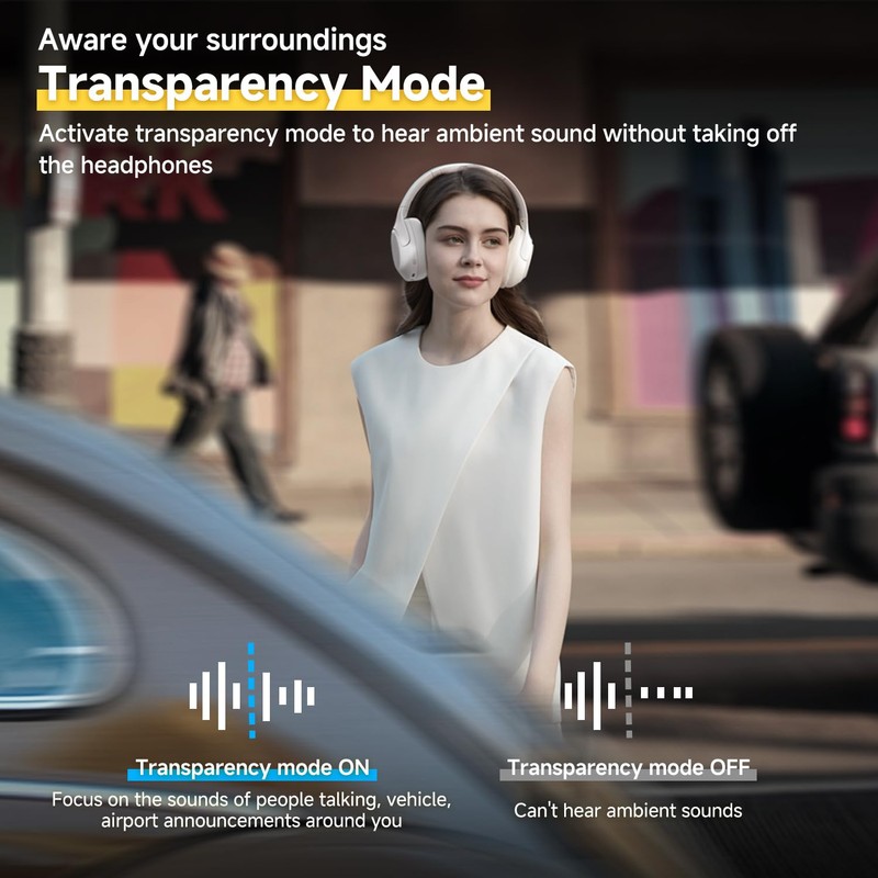 - ACTIVE NOISE CANCELLATION & TRANSPARENCY MODEActive noise cancelling blocks out 90% noise and immersive yourself in superior sound anywhere. Activate transparency mode allows you to hear ambient sound without taking off the headphones.