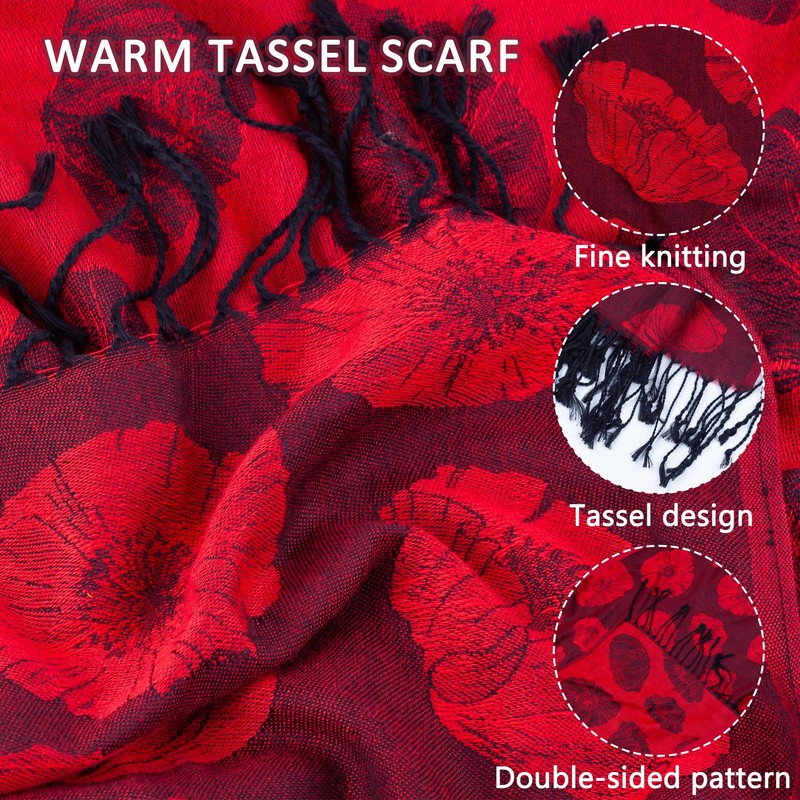 QCYFJZFU Soft Poppy Scarf Cashmere Blend, Warm Cosy Womens Shawls and Wraps Poppy Print Tassel Shawl Scarf for Remembrance Day