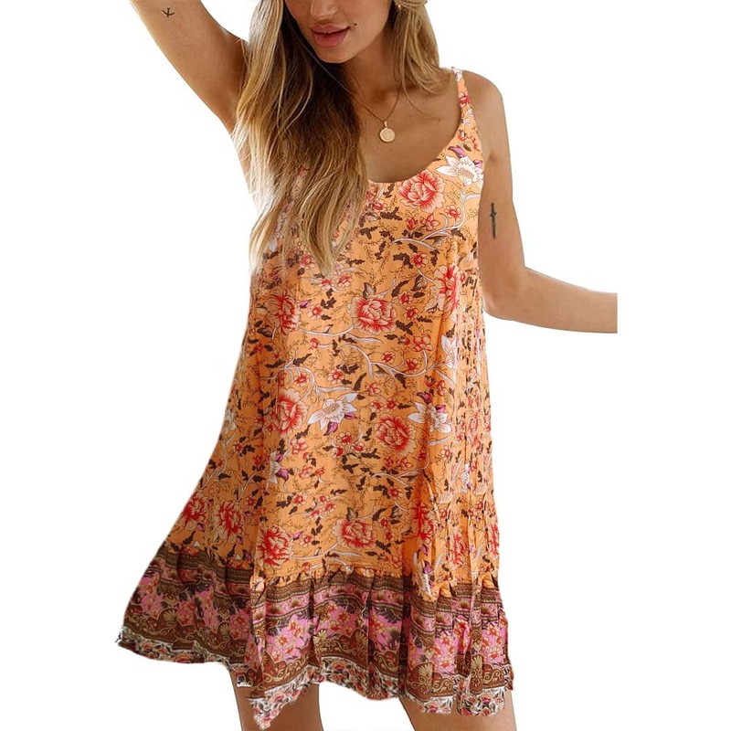Qearal Women's Bohemian Summer O Neck Sleeveless Ruffle Flowy Beach Mini Dress S