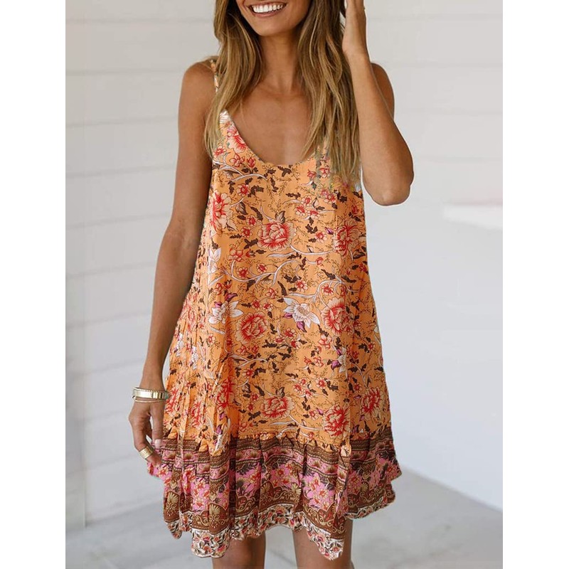 Floral Boho Summer Dress Scoop Neck Adjustable Spaghetti Straps Sleeveless Backless Party Dresses with Pocket