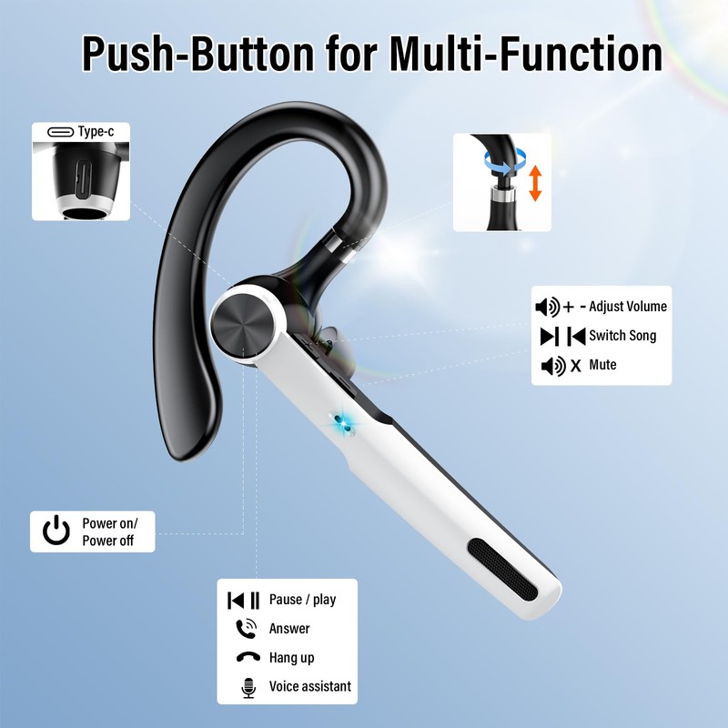 - Superior comfort and flexible design: Lightweight earpiece and soft silicone ear pads ensure long-lasting comfort. The included earplugs (S/M/L) ensure a good fit and effective noise isolation. The headset wireless bluetooth features an ergonomic design with 360 rotatable ear hooks and 180 rotatable arms that can be adjusted to choose the most comfortable fit.