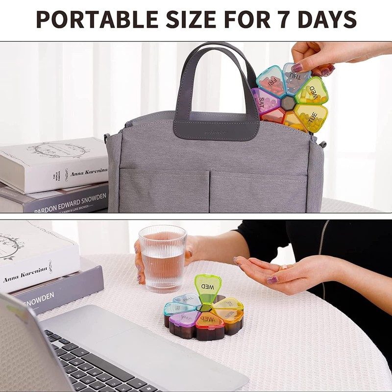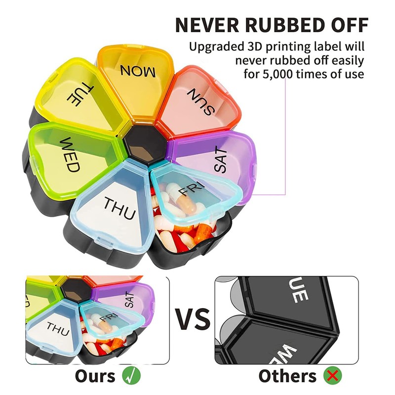 - 【Food Grade PP Materials】 -- The 7 day pill container is made of food grade PP material, safe to keep your daily medication. Rainbow color lids and bigger week day labels, make managing your weekly medicine simple