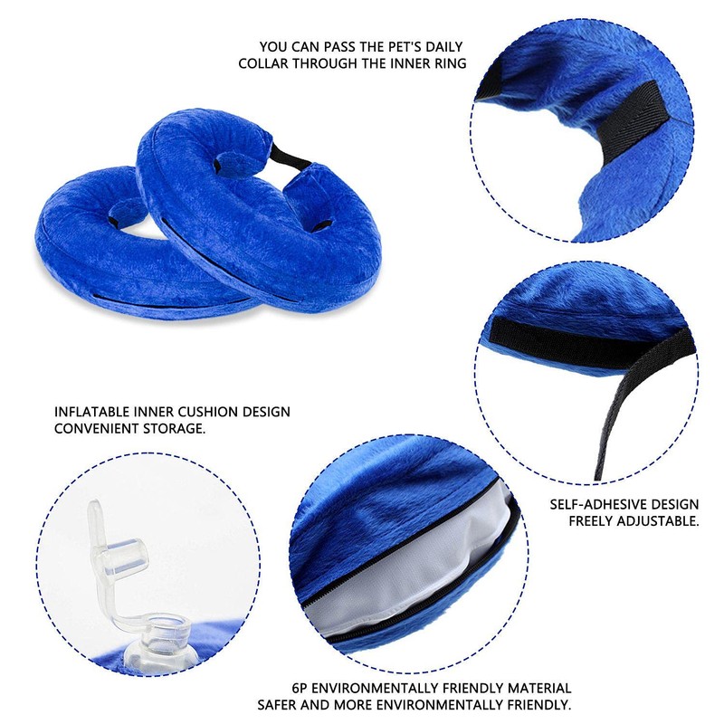 - Application: There is a strap on the opening of the collar, which you can stick together to perfectly fit your pet's neck, and put one side of the strap behind the dog's neck to avoid bites. You can put the pet's day collar into the inner ring to keep the inflatable collar stable.