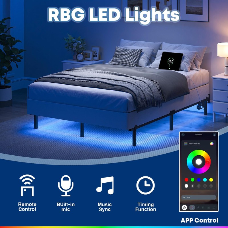 - Queen Bed frame with RGB LED light strips: You can use the included remote control or mobile app to set the color, brightness, mode, timer function of the LED light to meet the needs of different styles and different scenarios, making your home life more colorful.