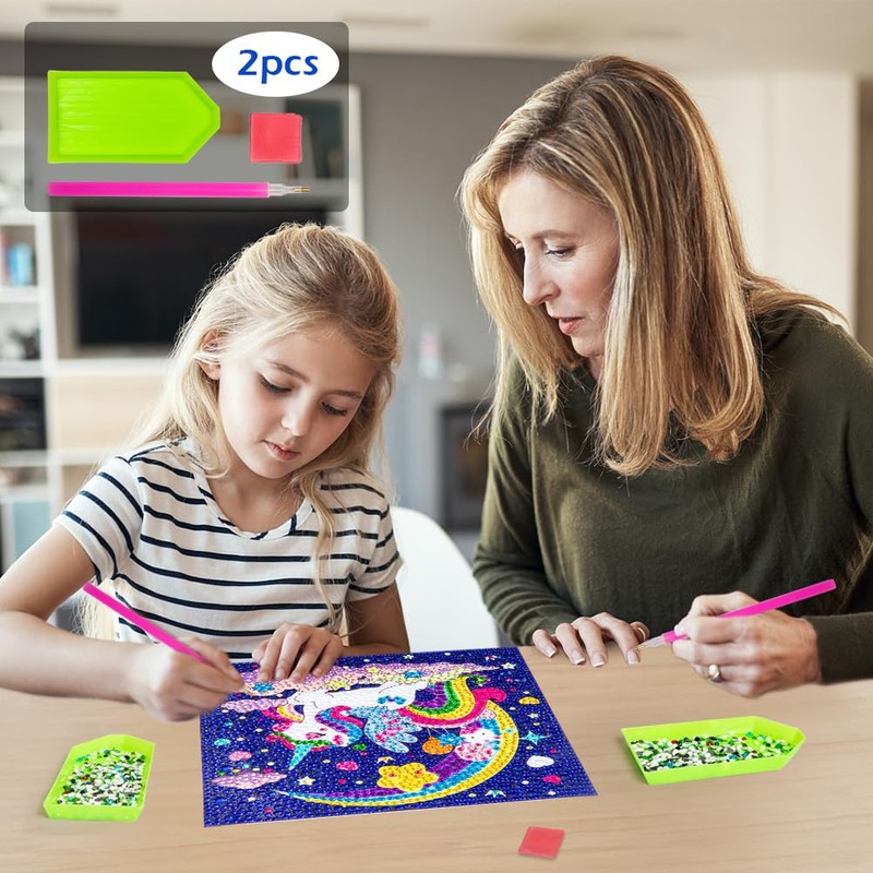 - Kids Diamond with Frame - Our kids kits comes with everything you need. The kits for kids includes pre-printed textured art canvas with the wooden frame, crystal diamonds, 2 pcs point drill pen, tray, mud and a beautiful packing box. Our kits with the pre framed is the great decor for placing on the table and hanging on the home wall, such as babyroom, living room and so on, perfect room decoration