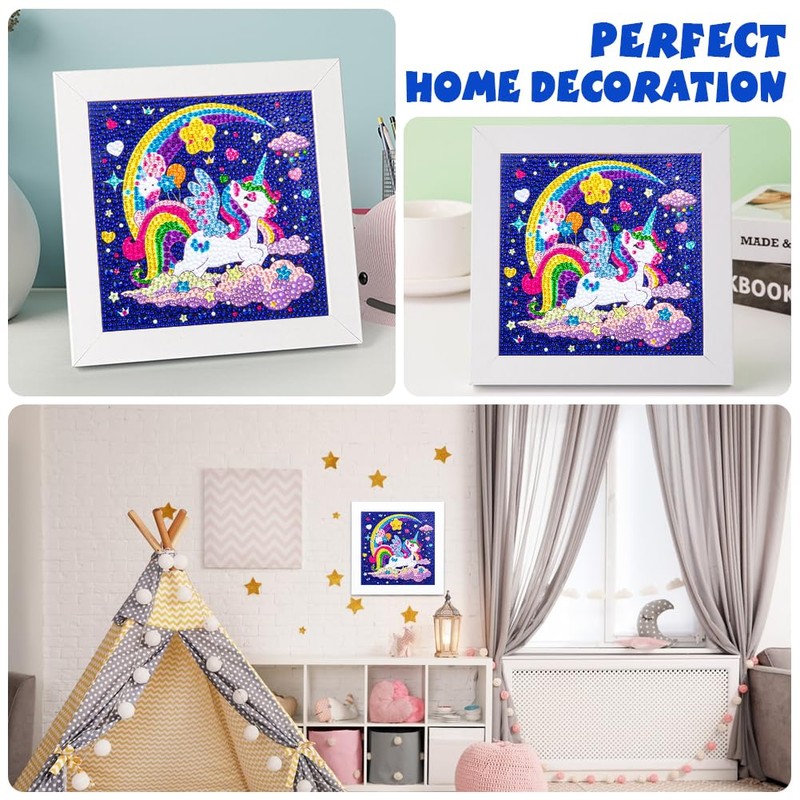 - Kids Diamond with Frame - Our kids kits comes with everything you need. The kits for kids includes pre-printed textured art canvas with the wooden frame, crystal diamonds, 2 pcs point drill pen, tray, mud and a beautiful packing box. Our kits with the pre framed is the great decor for placing on the table and hanging on the home wall, such as babyroom, living room and so on, perfect room decoration