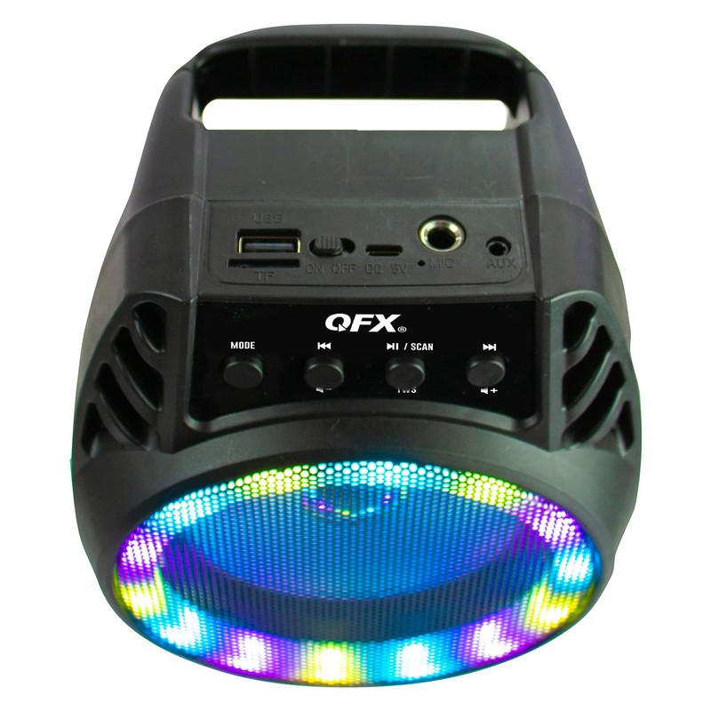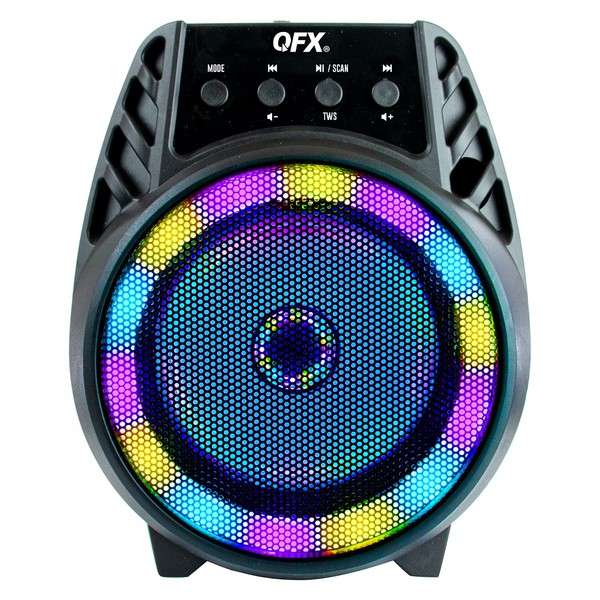 QFX BT-64 TWS Bluetooth Rechargeable Portable Speaker with 4” Woofer LED Party Lights, Microphone Input, AUX Input, USB Port, TF Card Slot, Black