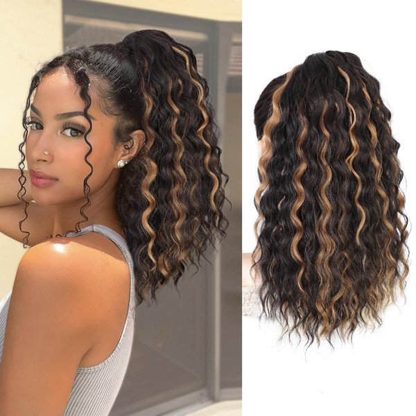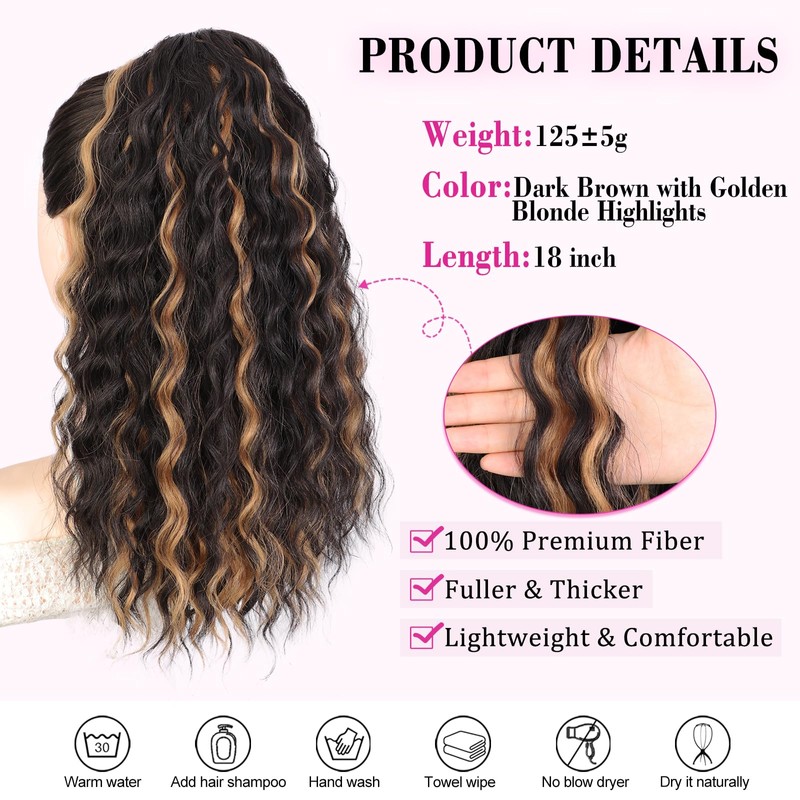 QGZ Ponytail Extension Drawstring Ponytail for Black Women 18 Inch Synthetic Long Afro Curly Fluffy Ponytail for Daily Use(Dark Brown with Golden Blonde Highlights)