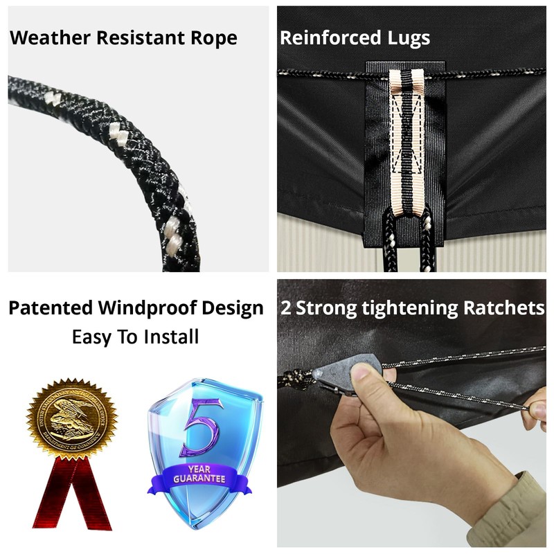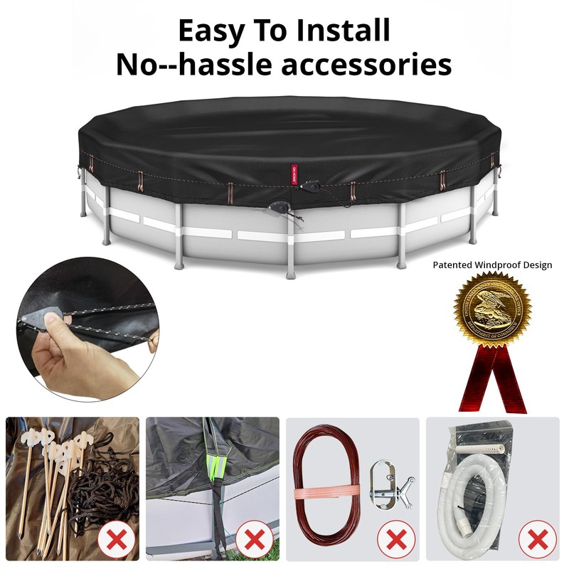 - EXCLUSIVE PATENTED TRIPLE WINDPROOF DESIGN & HASSLE-FREE SETUP: Featuring a double ratchet system + sectional tension straps for reinforced security, with the load-bearing hanging loop (for hanging sandbags/heavy objects), it can withstand strong winds of more than 100 miles per hour. Our pool cover is easy and quick to install, no hassle accessories. (unfold and cover the pool, adjust the bottom ratchet tension is done)
