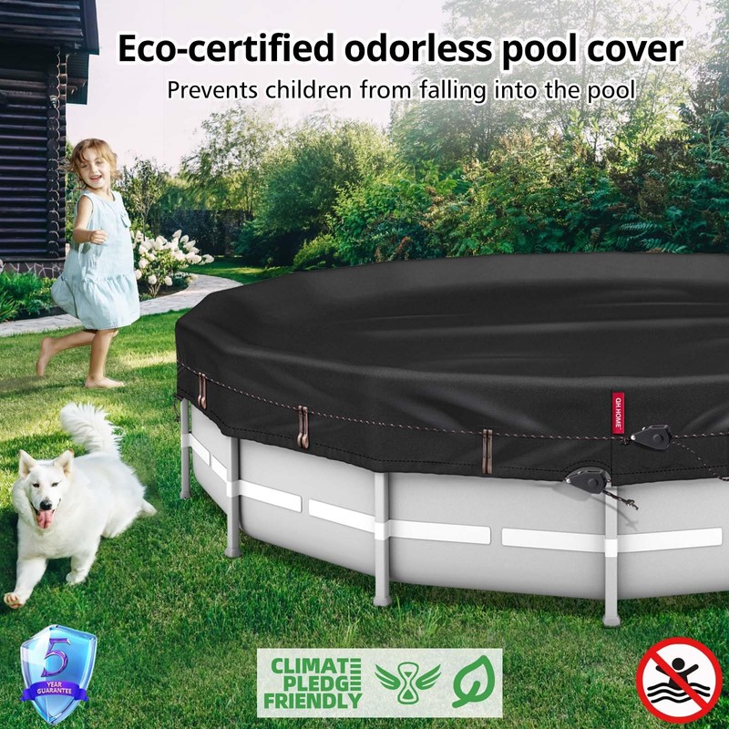 - SAFER & ECO-FRIENDLY MATERIAL: Our round pool cover is Amazon Friendly Climate Certified and made of odourless, eco-friendly PU material. It is safe for children and pets in hot environments, Effectively avoids the discoloration problem of silver coating, so it will not pollute your swimming pool. Let you and your family enjoy the whole summer.
