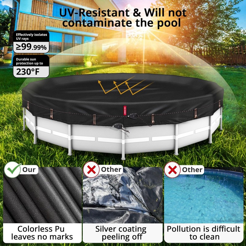- 5-YEAR WARRANTY—FADE-RESISSTANT: This 18ft pool cover is crafted from upgraded 800D Oxford fabric, The UPF50+ certified fabric blocks 99% of UV rays, while the PU coating withstands temperatures up to 230°F (compared to the 180°F limit of ordinary pool covers), effectively preventing fading of the silver coating and sunlight damage, preventing algae growth. Fade-proof and durable for 5 years guaranteed. Ensure the long-term stability of the pool cover.