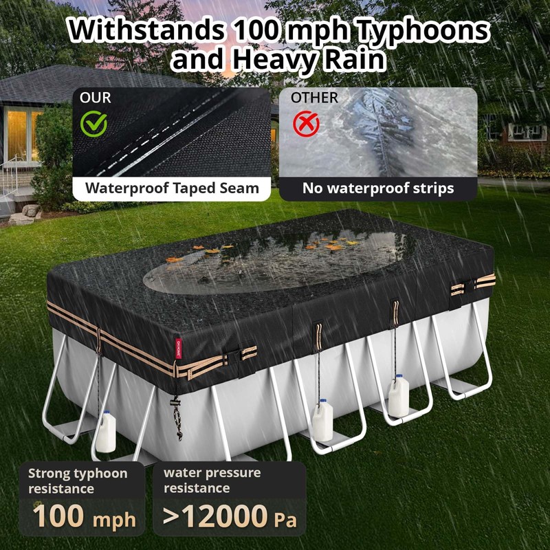 - 【Upgraded Tear-resistant Design】The edges of our pool cover adopt a flat-laid seamless design (compared with traditional double-sewing, the risk of edge cracking is greatly reduced). The upgraded 500D Oxford fabric has a tear strength of 330 pounds (laboratory test), which is 3 times more durable, far exceeding 420D/210D fabric, ensuring the long-term stability of the pool cover.