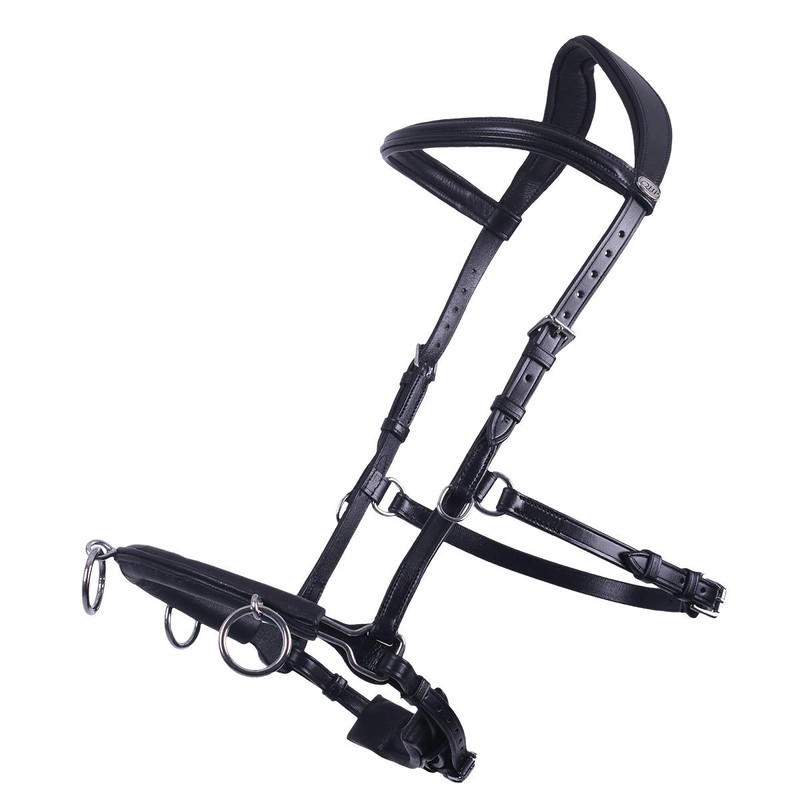 Can also be used as a bridle. Can be used with or without a bit. Equipped with three rings on the noseband. Nose strap with chain in the core. With anatomically shaped headpiece that reduces pressure on the ear canal. Equipped with removable bit clips. Padded noseband, headband and headpiece. Silver-coloured stainless steel fittings.