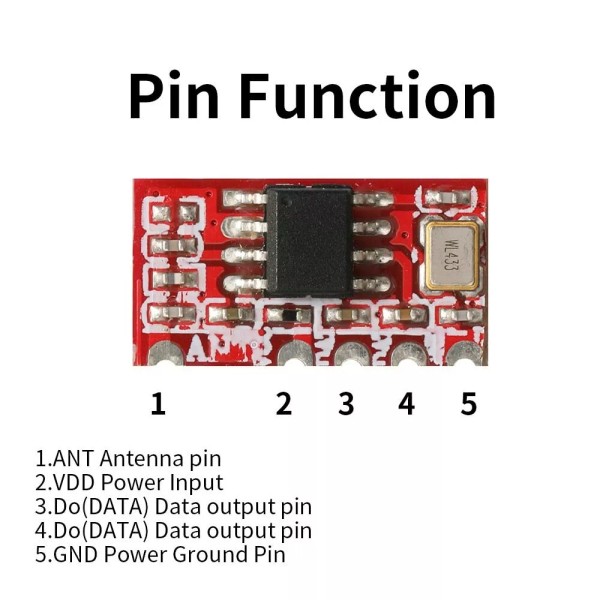 Product Model: TX217SMD-4. Working Frequency: 433.92Mhz. Working Voltage: DC 2.0~5.0V. Working Current: 6mA. Modulation: ASK/OOK Transmit Power: -108dBm. Working Temperature: -40℃-85℃. Size: 16mm x 8mm x 2mm