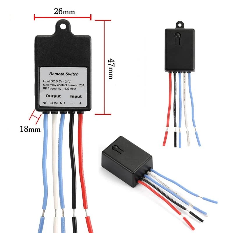 PCB size: 47 x 26 x 18 mm (L,W,H), output terminals: NO , NC , COM.