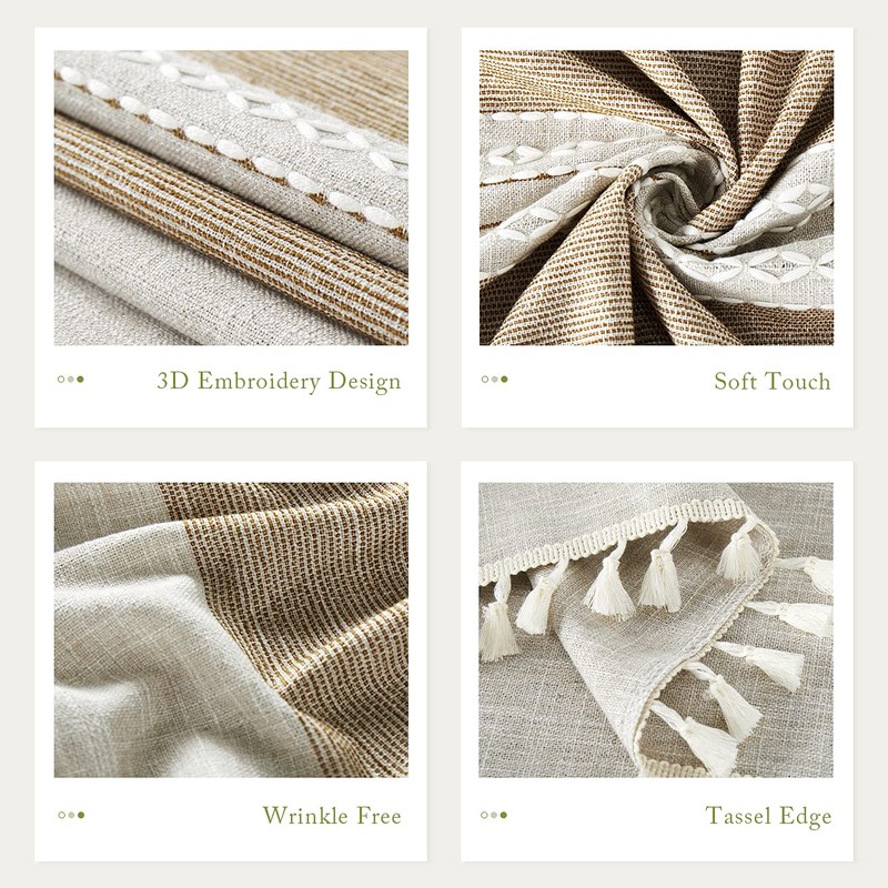 - OCCASIONS : Beautiful embroidered tablecloth with tassel hem, rustic farmhouse tablecloth design, creating a vintage but elegant home decoration. Best gift for the holidays,It is a great indoor table protector for dining room,kitchen table pads, coffee table cover, as outdoor tablecloth for birthday party, wedding tablecloth,buffets,picnics,brunches,catering, restaurants,hotel,patio table and so on