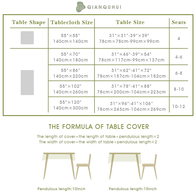 Available Sizes: Table cloth 55*55 inches,55 x 70 inches, 55x78 inches, 55 x 87 inches, 55 x 102 inches,55 x 120 inches.