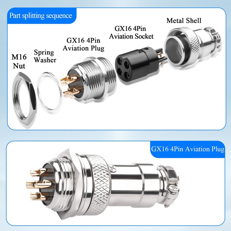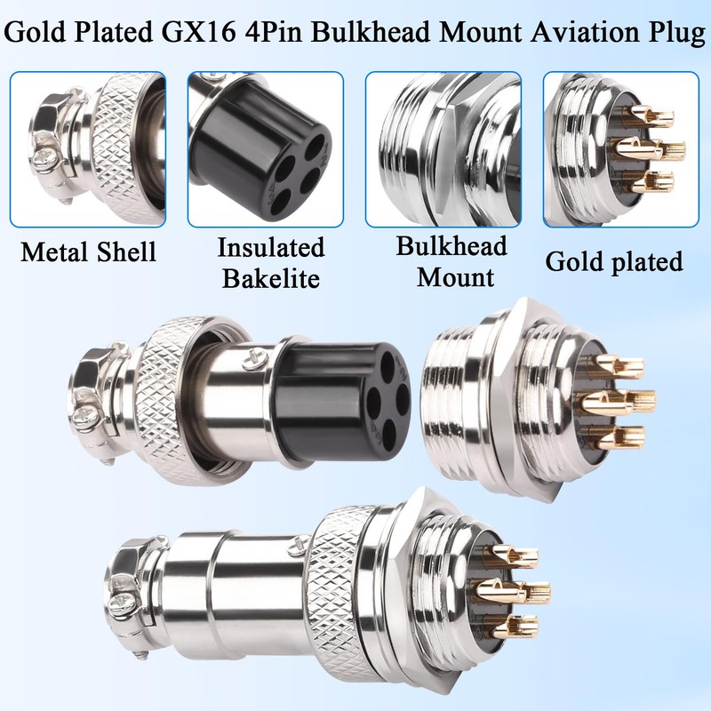 - 【Safe and Durable】GX16 4Pin Panel Mount Airline Plug Circular connector socket. The insulator is made of high quality Bakelite, safe and reliable. The shell is nickel-plated zinc alloy, sturdy and durable.