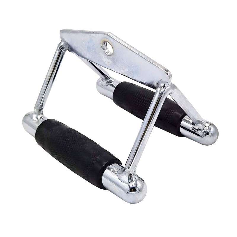 This deluxe Double D handle attaches to your home gym, Smith machine, etc Revolving hinge, rubber grips, Chinning triangle low roll cable handle. Great for seated row exercises to develop your back, shoulders, forearms, triceps, and biceps. Double D design allows you to exercise both arms at once. Made of top-quality steel with chrome finish to prevent the grip from corrosion and rust. Support up to 880 lbs (400 kg). Dimensions: 7 x 6 x 5 , weighs 5 lbs