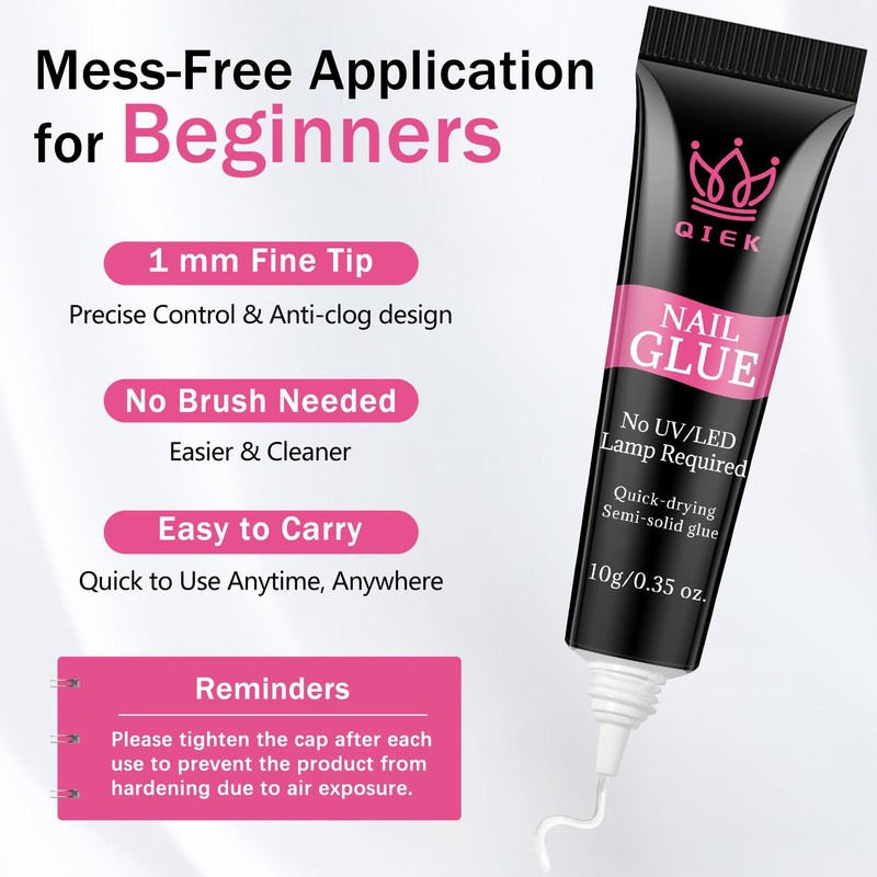 - Easy, Precise Application: QIEK gel nail glue no brush needed! 0.5mm nozzle dispenses smooth semi-fluid nail glue gel for drip-free, clog-free, controlled use. Ideal for first-timers and pros alike.