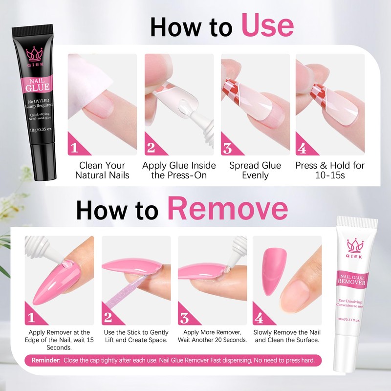 - 10-Second Quick Dry: Enjoy salon-quality nails in seconds! QIEK press on nail glue dries in just 10 seconds—no U V lamp required, no U V damage. Perfect for nail art beginners at-home or on-the-go manicures.