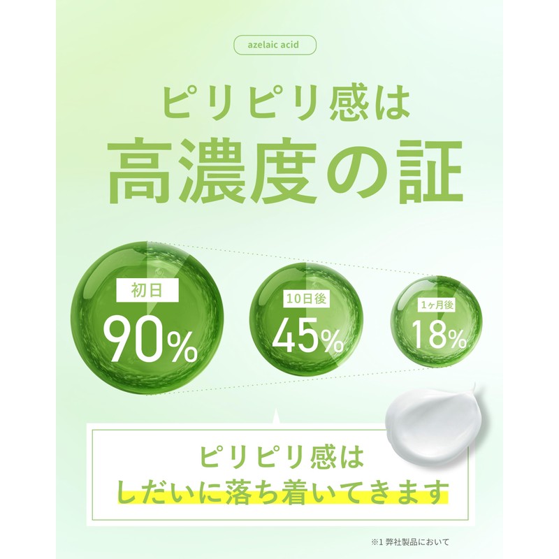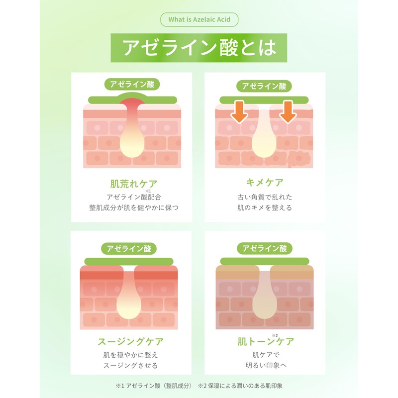 • (20% Raw Azelenic Acid Blend) Formulated with a high concentration of 20% raw azelenic acid (skin toning ingredients). In addition to smooth out the skin that is concerned about stickiness caused by sebum and pores, it also provides moisture to keep dry, rough and dull skin feeling refreshed