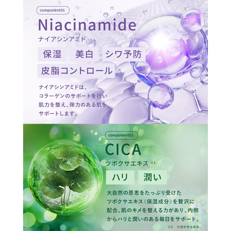 • (Cica, plant extract + hydrolyzed royal jelly for moisture and double care for skin) Extract and calendula root extract (skin-toning ingredients) prevent roughness for healthy skin. Ogon root extract and aloe vera leaf extract (moisturizing ingredients) provide moisture, while hydrolyzed royal jelly protein (skin toning ingredients) supports firmness