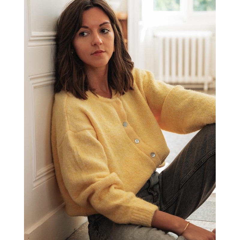 Qifeodm Women's Y2K Button Down Sweater Cardigan Long Sleeve Cropped Knitted Crewneck Sweater Open Front Crop Top Streetwear Yellow XL