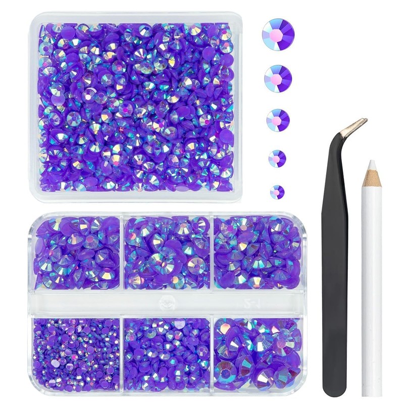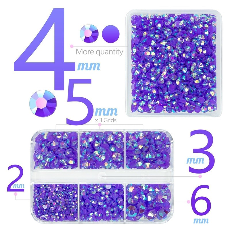 - ❤【2 Boxes Dark Purple AB Resin Rhinestones + Stainless Steel Tweezer + Pickup Pen】3060PCS Purple AB flatback jelly rhinestones are assorted in 5 sizes: 2mm 1300PCS / 3mm 450PCS / 4mm 920PCS / 5mm 350PCS / 6mm 40PCS. Dark Purple AB flatback Jelly rhinestones are very light and easy to carry, all gems are packed in each grid boxes according to different sizes, convenient to oragnize, no worry about rhinestones mixed together. Comes with 1 Tweezer and Pickup Pen for DIY Crafts.