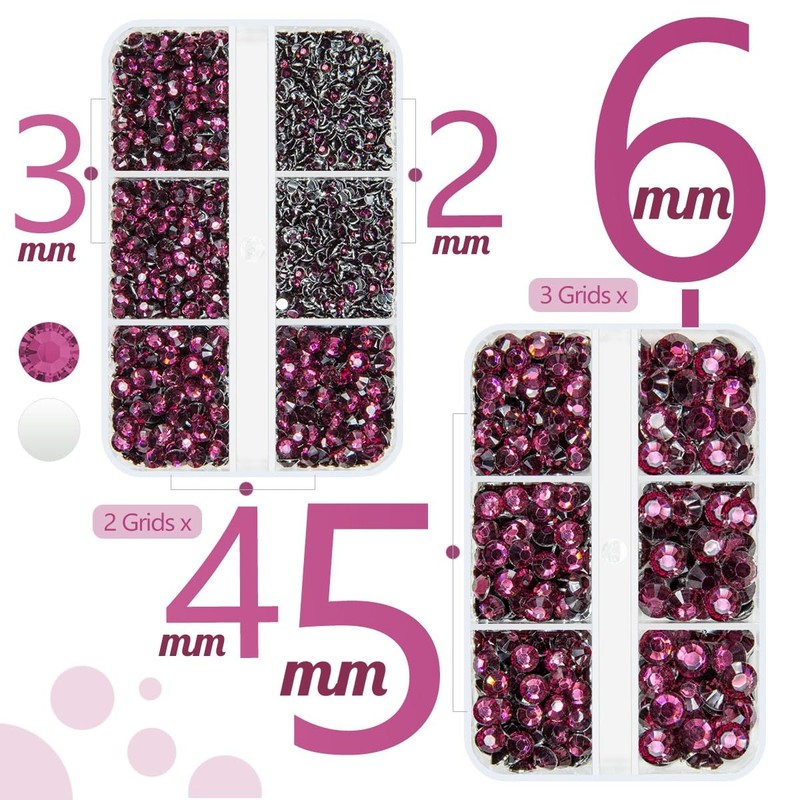 - ❤【2 Boxes 12 Grids Wine Purple Resin Rhinestones + Stainless Steel Tweezer + Pickup Pen】3060PCS Dark Wine Purple flatback resin rhinestones are assorted in 5 sizes: 2mm 1600PCS / 3mm 700PCS / 4mm 320PCS / 5mm 360PCS / 6mm 80PCS. Wine Purple flatback Resin crystal rhinestones are very light and easy to carry, all gems are packed in 12 grids boxes according to different sizes, convenient to oragnize, no worry about rhinestones mixed together. Comes with 1 Tweezer and Pickup Pen for DIY Crafts.