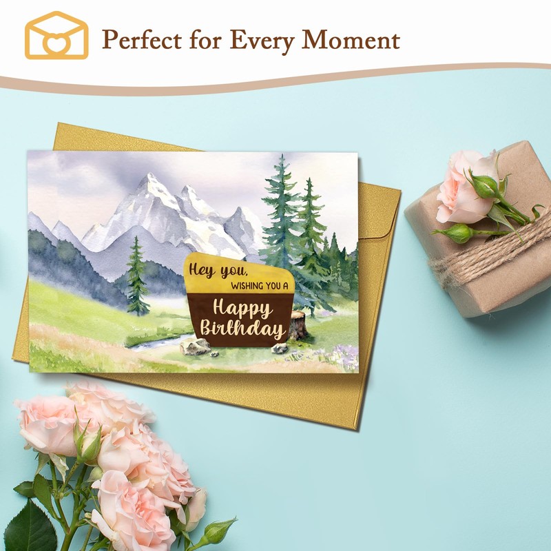 - "Hey You, Wishing You a Happy Birthday" card. Features a charming illustrated scene of a national park sign with forest and snowy mountain backdrop, perfect for anyone who loves the great outdoors.
