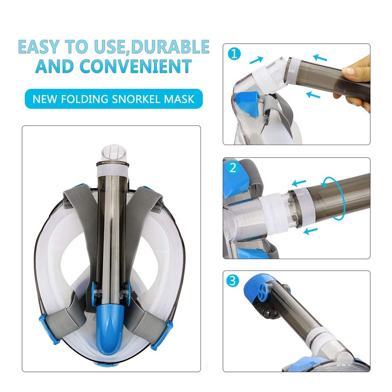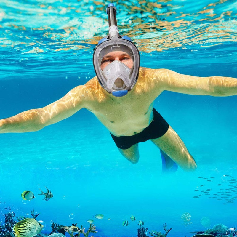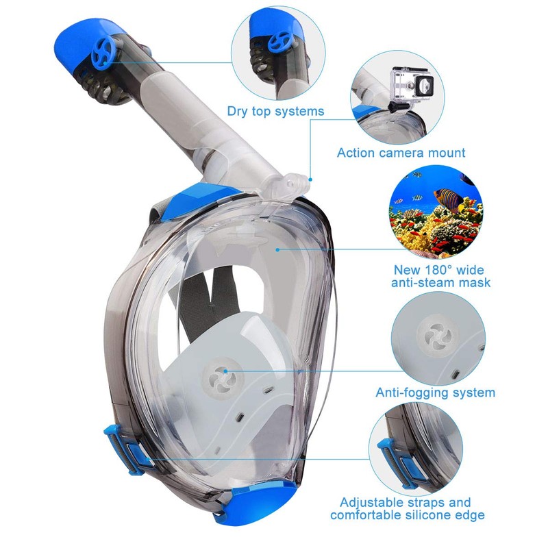 - ''' PROFESSIONAL ANTI-FOG & ANTI-LEAK DESIGN: Separate inhaling and exhaling channels stop the top snorkel mask from fogging up, and anti-fog coating on the lens and anti-fog inserts guarantees anti-fog effect; Advanced leak-proof silicone sealing mask with floating ball prevents salty water from entering in mask.#||# ENHANCED FUNCTIONS: Newest version snorkel mask full face adds two quick release buttons, which make it easier to wear. Highly elastic djustable shoulder strap and mask can perfectly fit your face. The breathing tube has a silicone band to prevent loss of the snorkel It is simple to install, Easy to fold and store, While also occupying less space.#||# FRIENDLY GIFT TO BEGINNERS: 180 degree full face snorkeling mask is easier to use than traditional diving mask and more friendly to beginners and youth, Additional removable camera mount enables you to install camera and records the dreamlike underwater world, It’s a perfect present to family and friends; Use this sports snorkel mask and enjoy unforgettable vacation.#||# LIFETIME WARRANTY: We are professional suppler of snorkel mask and we have over 15 years experience of designing and producing diving mask, We promise that we provide the premium quality product with the lowest selling price, If there is any question, Please contact us, and we accept a free replacement or full refund.'''