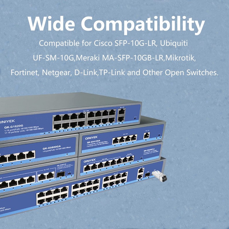 Compatible with Cisco SFP-10G-LR, Ubiquiti UF-SM-10G, Netgear AXM762, D-LINK DEM-432XT-DD, TP-LINK TXM431-LR, Zyxel SFP10G-LR, Qnap Nas SFP+, Mikrotik S+31DLC10D and other open switches.