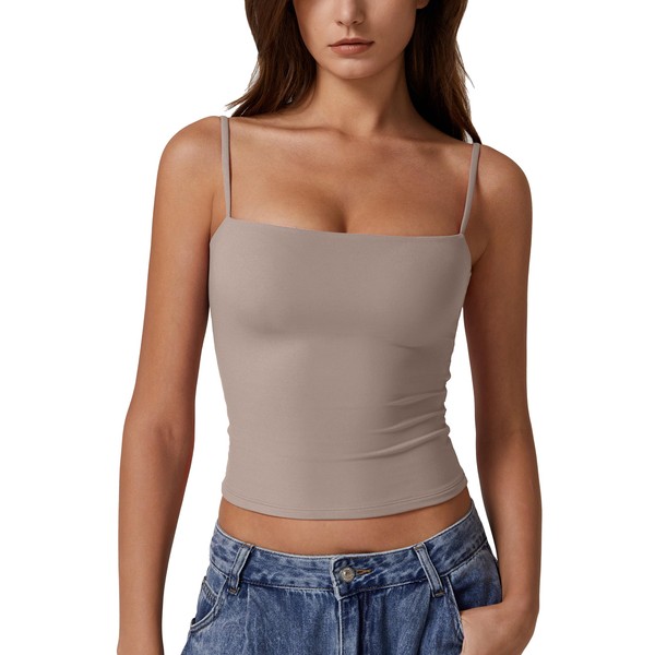 QINSEN Women's Double Lined Basic Tank Top Adjustable Spaghetti Straps Sleeveless Camisole Shirts Taupe Gray S