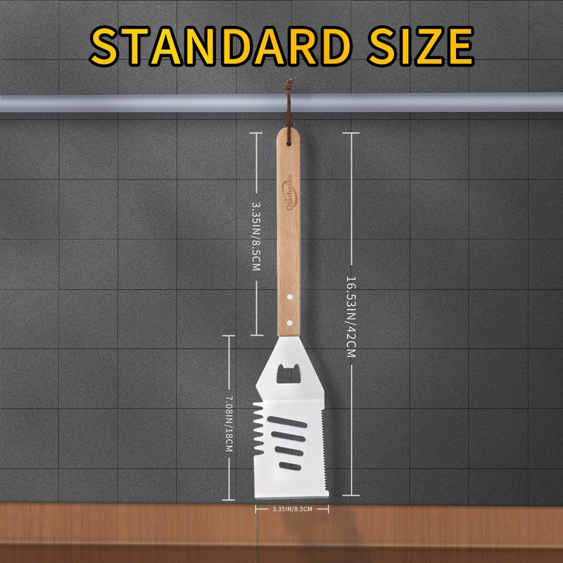 Qinshaine 4-in-1 BBQ Spatula, Multifunction Grill Spatula with Wooden Handle, perfect for BBQ grills and kebabs for camping picnics
