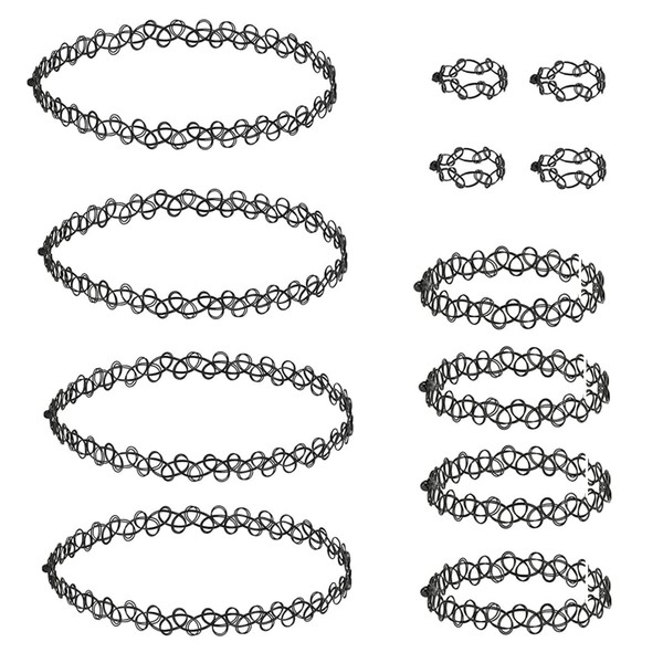 Qinsky Choker Necklace Sets,12 Pcs Tattoo Necklace Choker Necklaces Bracelets Rings Plastic Elastic Stretch Necklaces Tattoo Choker Jewelry for Women Girls(Black)